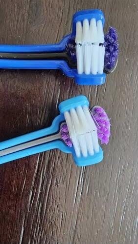 "Seit ich diese Zahnbürste benutze, geht das Zähneputzen bei meinem Hund viel schneller und gründlicher! Dank der 3-seitigen Borsten werden alle Zahnflächen gleichzeitig gereinigt, was die Zahnpflege einfacher und stressfreier macht."