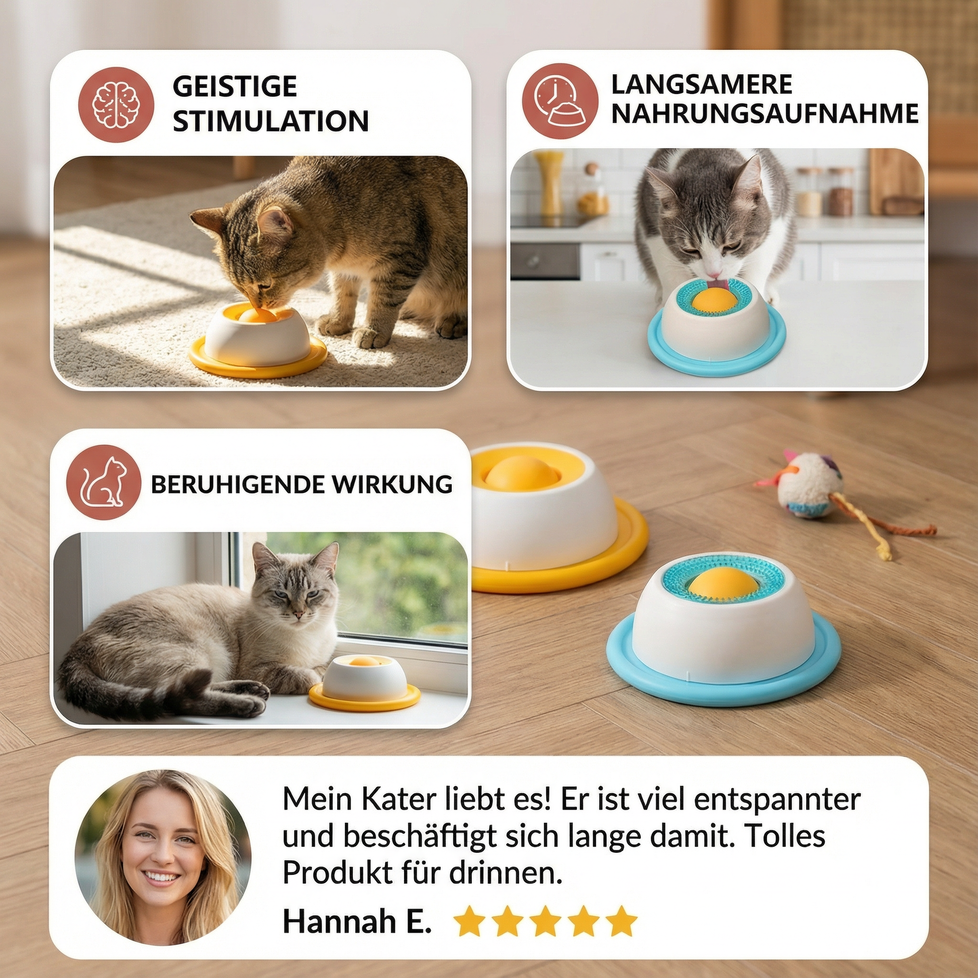 "Ich bin wirklich begeistert von diesem Leckspielzeug, da meine Katze damit deutlich langsamer frisst und viel ruhiger wirkt. Besonders praktisch ist, dass sie länger beschäftigt ist und ich mir keine Sorgen mehr um hastiges Schlingen machen muss."