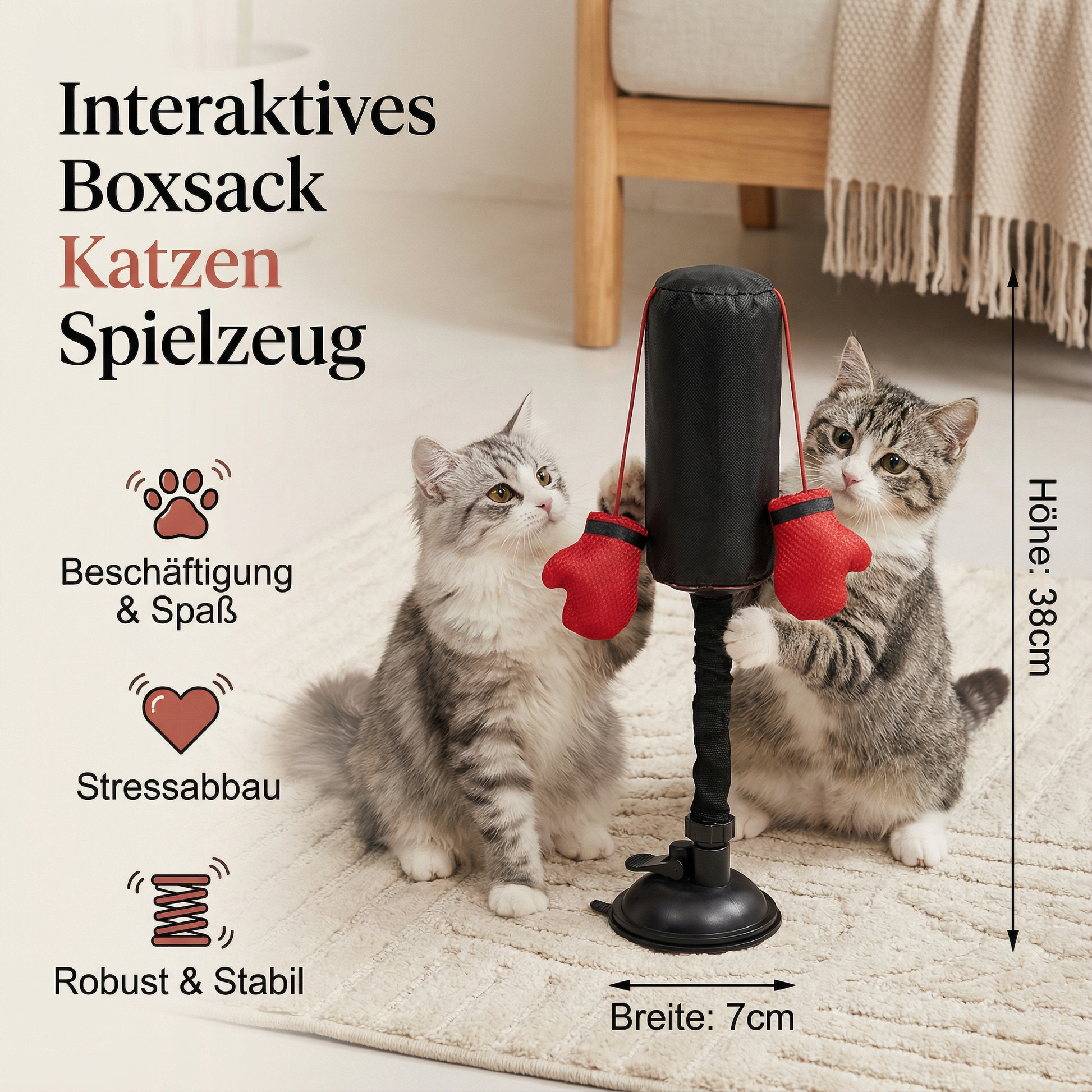 Katzen lieben es, zu jagen, zu schlagen und mit Objekten zu interagieren. Der interaktive Boxsack ist perfekt darauf ausgelegt, diese Bedürfnisse zu erfüllen. Er schwingt bei jedem Schlag zurück, was deine Katze motiviert, weiterzuspielen. Gleichzeitig bleibt das Spielzeug dank der stabilen Saugnapfbasis sicher an seinem Platz.